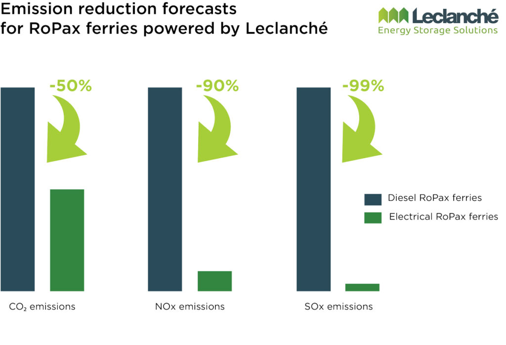 Leclanché’s first electric hybrid project is underway for Wasaline, the Nordic-based shipping company and ferry operator, and will be one of the world’s first roll-on, roll-off passenger (RoPax) ferries with zero-emission sailing mode upon commissioning. Leclanché’s 2.35MWh capacity batteries are configured for the 800-passenger vessel’s operation while in port without using main engines. The energy storage system is charged from shore power, which is also used for the vessel’s other power needs during its stay in harbor. In total, the Wasaline RoPax ferries are forecast to reduce CO₂ emissions by 50%, NOx by 90% and SOx by 99%.
