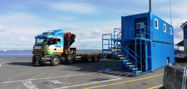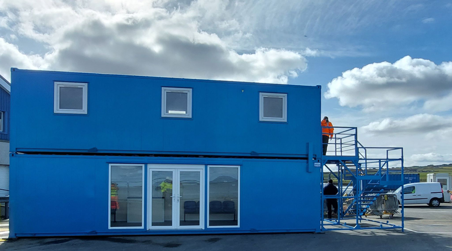The portable cruise terminal was delivered to the Orkney Harbour Authority by Advanté Transport, with assistance provided by David Watson Transport. The portable terminal is split into a reception area on the ground floor and an office area on the top floor.