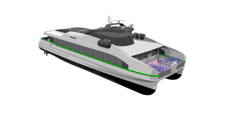 The builders say it will be classed by DNVGL and approved for operations above 20kts by the Norwegian Maritime Directorate. Constructed around an aluminum hull, top speed will be 23kts and the vessel will be capable of carrying 147 passengers. Details of the battery and propulsion system are yet to be revealed.