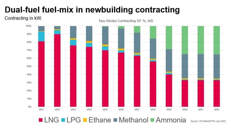 Dark blue: The uptake of methanol is increasing to around 30% of all dual-fuel engines contracted