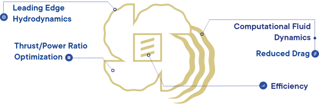 Using CFD, BlueNav engineers demonstrated that the bumps on the flippers of cetaceans and the striations on their bellies reduce drag and increase fluid flow efficiency. The Whale Design will be available in Q2 2024.