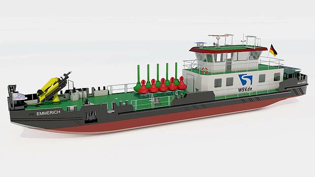 The lead vessel in the new series, MS Emmerich, has been in operation for the WSA Rhine since July 2020. As the first multipurpose vessel for the WSA, it is the prototype for the series currently under construction. The new traffic safety vessels are all 33.3m long and 7.4m wide, each having a crane system and landing ramp. They will replace the current vessels MS Neuss, MS Rees, MS Köln, MS Homberg and MS Bonn and will be operated on the German part of the Rhine between Duisburg and Bonn over a distance of approximately 130km. Besides checking and servicing navigation signs, their tasks also include clearing shipping disruptions, transporting vehicles and work equipment and salvaging flotsam.