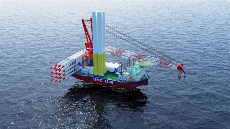 Fu Qiang, director of CIMC Raffles Strategy R&D Centre, added, “The vessel is designed for the European market, with a maximum lifting weight of 3,500 tons and a maximum lifting height of 228m above sea level and can carry seven sets of 14MW or four sets of 20MW wind turbine components. This vessel is equipped with a dual-fuel main engine and hybrid battery system, reducing carbon emissions and fuel consumption. Given the complex international market and rising raw material prices, the design offers better economics and stronger competitiveness.”