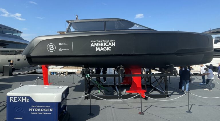 As part of the 37th America’s Cup Protocol for its challengers, under the deed of gift principle that the defender defines the rules of the next AC, Team New Zealand included stringent features for the tenders that are to keep up with the competing AC75s in September 2024 in Barcelona, Spain. The AC defender imposed the supply of at least one flying chase boat powered by 160kW fuel cells running on hydrogen, capable of maintaining 30kts in cruising speed over a minimum 150 nautical miles, while achieving a maximum speed of 50kts for over one hour in total.